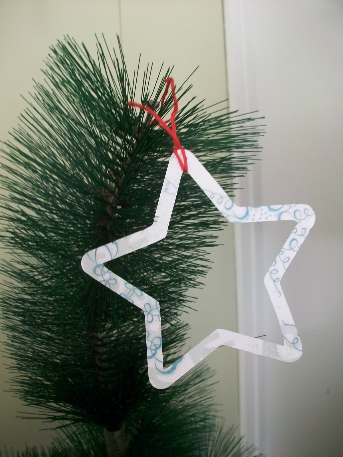 So I'm living in France and the idea is to move back to America, but of course I am really homesick, especially at this time of year. I can't buy a bunch of Christmas stuff, because we will already have to send way too much stuff over there when we move, and it is EXPENSIVE!!! So what to do??? Borrow my mother-in-laws artificial tree and make my own little ornaments/decorations out of what I have on hand...my SLICE machine, cardboard from my mom's Christmas package to us, some figgy pudding paper, my crop-a-dile, eyelets, and some ribbon, including the strange metallic ribbon that is part of the Webster's pages hollywood vogue line! Hey, looks like Tinsel to me!!! And yes of course I brought all my scrapbook supplies with me to France!!!! Living without them for this year is really just out of the question. So without further ado, the close-ups: